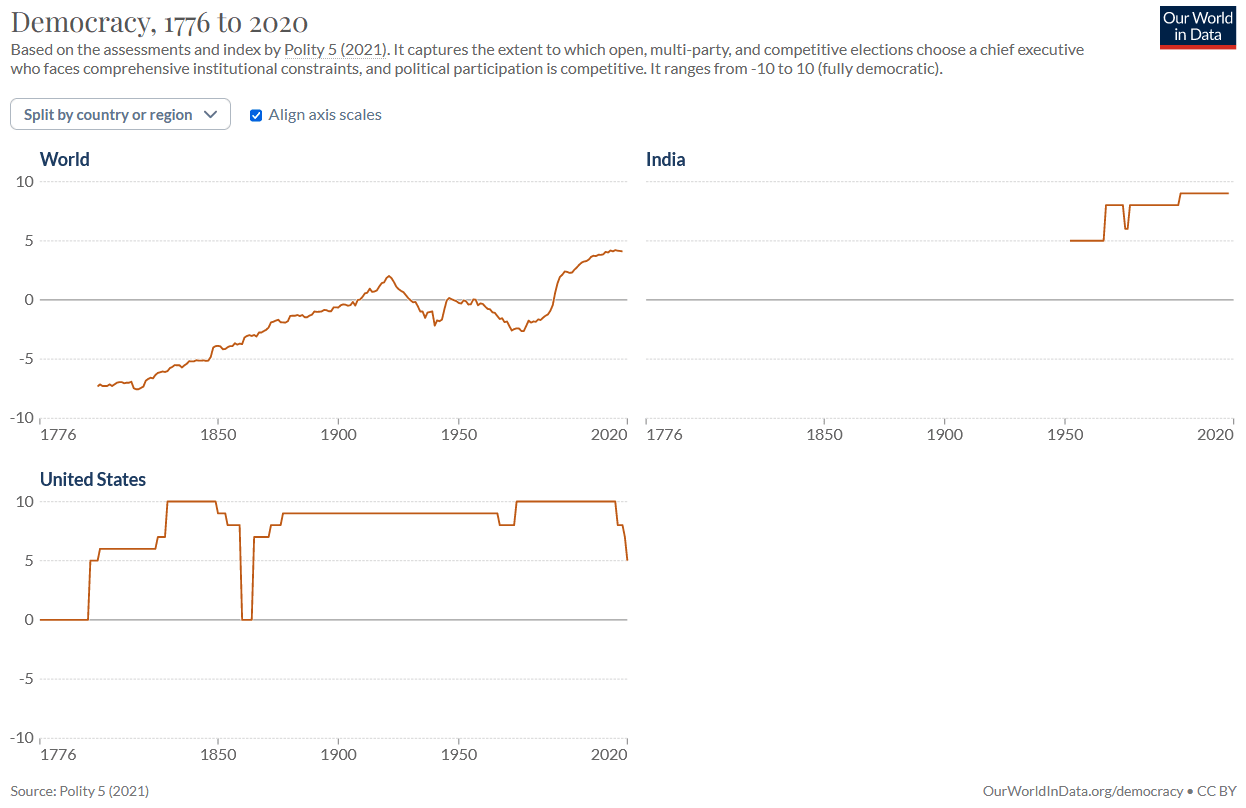 Even then the different datasets do not agree with your statement though - using the Polity dataset again solely because it's the one I showed above, we see world levels of democracy at almost their highest levels ever, in contrast to your VDEM claim that democracy has fallen to mid-1980s levels. One of the biggest drivers for the reduction in capita-weighted-democracy for VDEM is India, but Polity actually records India as being extremely democratic - actually more democratic than the US now! Again, this seems clearly absurd to me.
