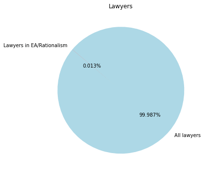 The number of lawyers in the US is roughly 1.3 million, or 0.4% of the population. In rationalism/EA, this number is higher, at 1.7%. I think basically all white collar professions are overrepresented due to the nerdy nature of the community.