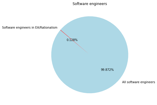 4.4 million software engineers in the US, or 1.3% of the population. In contrast, 56.5% of the lesswrong survey worked with computers, another dramatic overrepresentation, reflecting the particular appeal of the community to tech nerds. This represents an estimated 5650 software engineers in the US.
