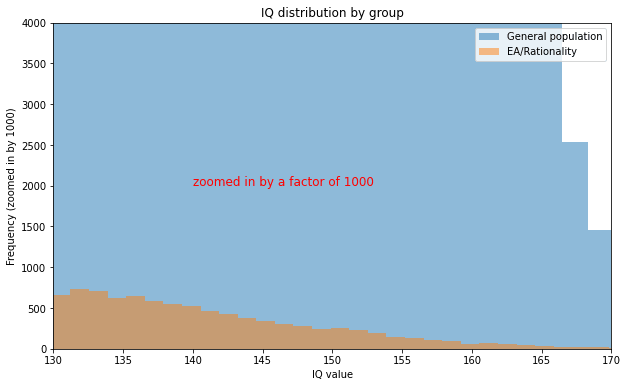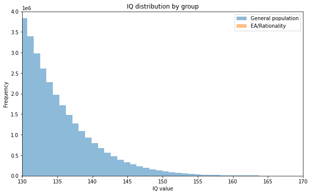 Let’s take the 20000 or so rat/Eaers, and take the 128 median IQ estimate at face value, assuming the same standard deviation, and compare that to the general population of the developed world (roughly 1.2 billion people), assuming an average IQ of 100. We will assume a normal distribution and SD of 15 for both groups. Obviously, this is a rough approximation. Now we can put together a histogram of how many people are at each IQ level, restricting our view to only very smart people with more than 130 IQ: