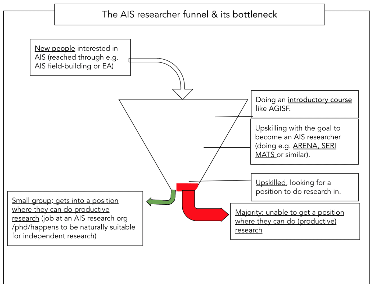 Alleviating a bottleneck for scaling the AIS research field by making independent research suitable for more people: it seems that we need a lot more people to be working on solving alignment. However, talented individuals who have invested in upskilling themselves to go do AIS research (e.g. SERI MATS graduates) are largely unable to secure research positions. This is oftentimes not because they are not capable enough of doing the research, but because there are simply too few positions available (see footnote). Because of this, many of these talented individuals are left with a few sub-optimal options:
