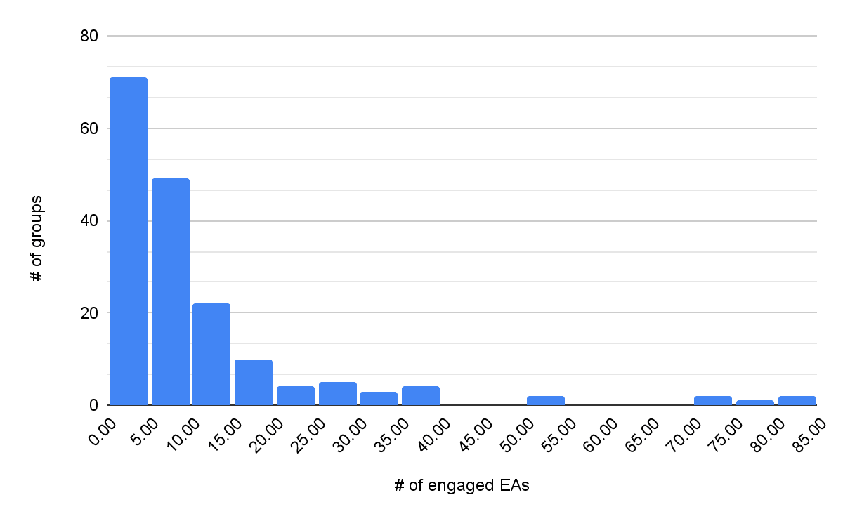 - While the total number of attendees per group stayed the same, the number of members who engaged with EA deeply — defined as 100 hours of engagement with EA content and taking some significant action — increased significantly. That is, the mean number of “engaged EAs” per group doubled (from 6 to 12) and the median even tripled (from 2 to 6). We think it’s plausible that this suggests that it has become easier to deeply engage with EA for people around the world (e.g. through accessible fellowships, more conferences, and higher Forum activity).