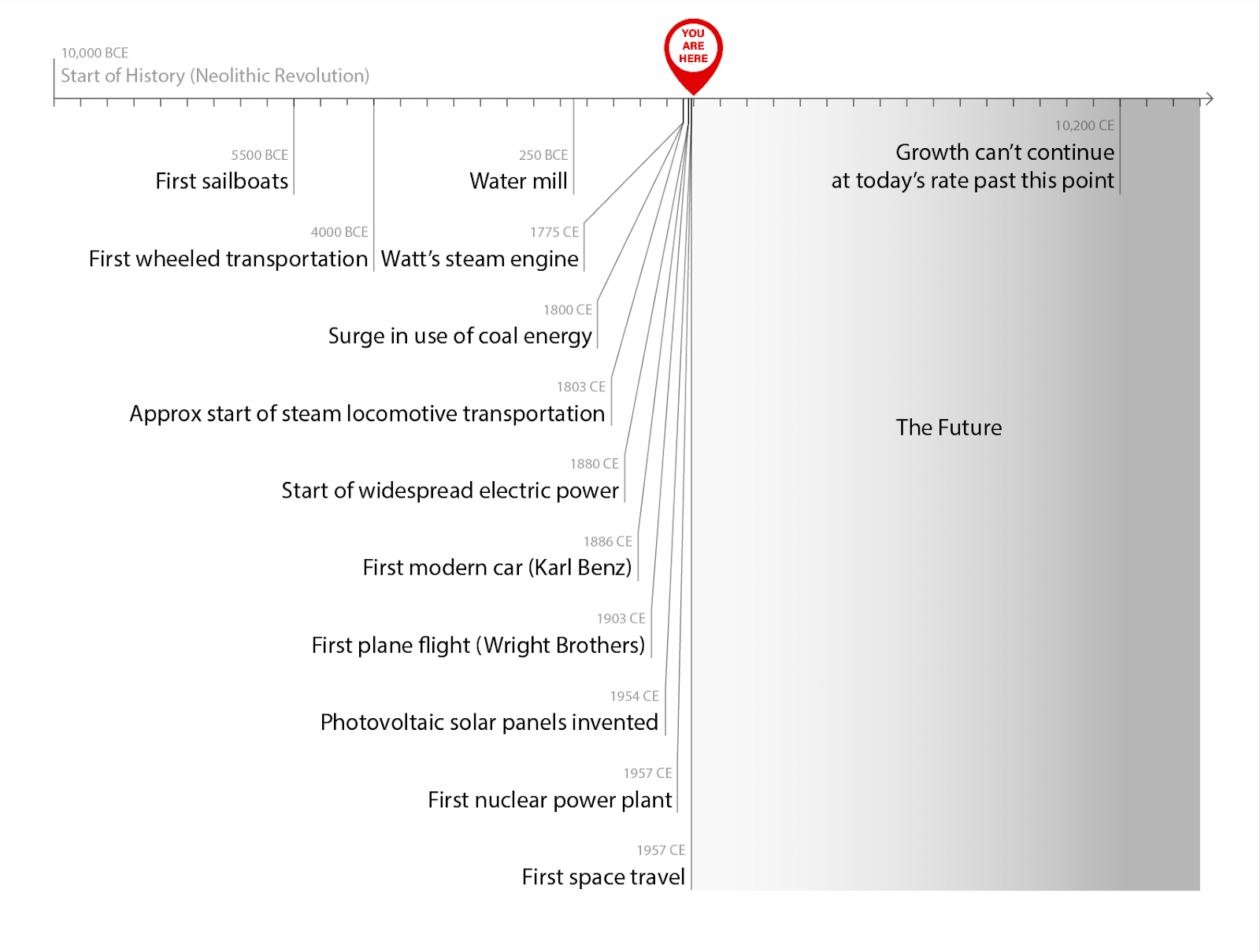 In un articolo precedente ho sostenuto che gli eventi storici più significativi della storia sembrano raggruppati attorno ai tempi odierni, come illustro con questa linea del tempo. Essa è sulla scala di miliardi di anni, ma riscontriamo qualcosa di simile facendo zoom sulle scorse migliaia di anni: i maggiori progressi scientifici e tecnologici sono raggruppati vicino ad oggi. Ecco una linea del tempo che illustra ciò concentrandosi negli ambiti del trasporto e dell’energia (credo che avrei potuto ottenere un’immagine simile scegliendo quasi qualunque altra categoria).