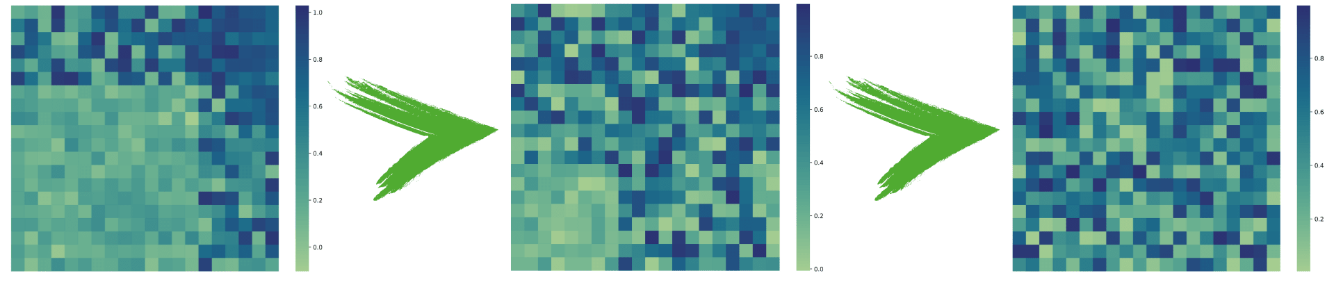 The first WSR is supposed to encompass the entire world with all its details (the impossible kind as discussed above). The second WSR is a pixelated simplification. It shows us that we need to aggregate components of the world state to reduce the dimensions of the first WSR. This aggregation happens on a geographical scale for the pixelated version[3]. The third WSR looks already quite different from the others. The 20x20 grid is not supposed to represent the geography of the world. It's not the geography or physicality in a particular location, that we care about. We usually care about higher aggregates. For this purpose, consider each cell to represent a particular feature of the world that seems reasonable to track. E.g., cell (0,0) represents Gross World Product (GWP). Cell (2,19) represents Total World Population[4][5]. The color represents the degree of a feature's manifestation (which is normalized between 0 and 1). E.g., the higher GWP is, the higher the cell's value and the darker the cell's color. The grid in the third WSR represents a simplified state of the world that is more convenient to work with[6].