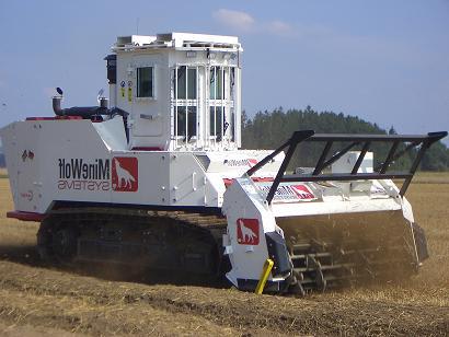 Special excavators drive over land - > swinging weights detonate anti personnel mines and other explosives (or they get crushed) -> ordnance explodes -> less casualties + land can be used