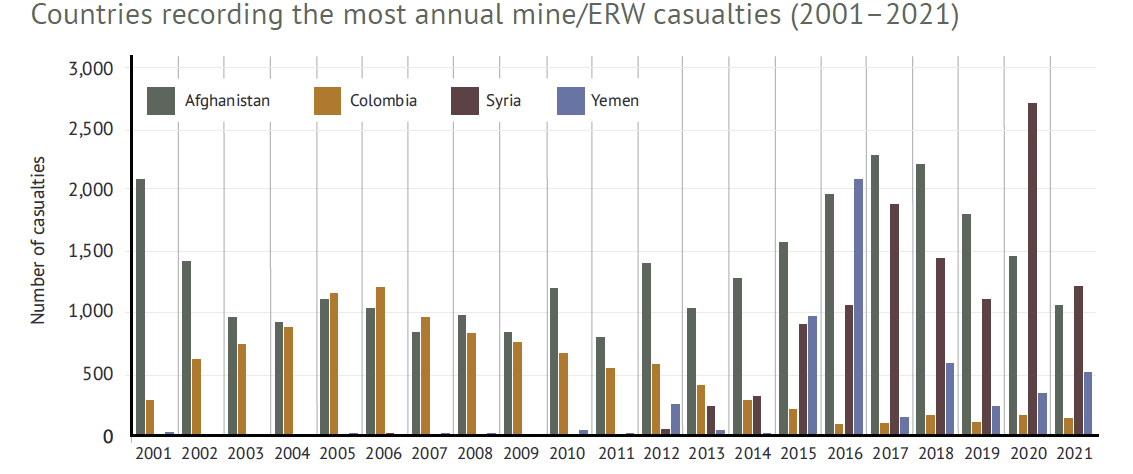 Landmines, IEDs and UXOs are differ in many ways and thus are used by various actors in different places. There is no data source which bundles all forms of contamination in one place. I have gathered sources to provide a rough overview in the respective categories. Most casualties occur due to the use of IEDs and explosive remnants of war, anti-personnel mines constitute only a part of the issue (Landmine Monitor, 2022).