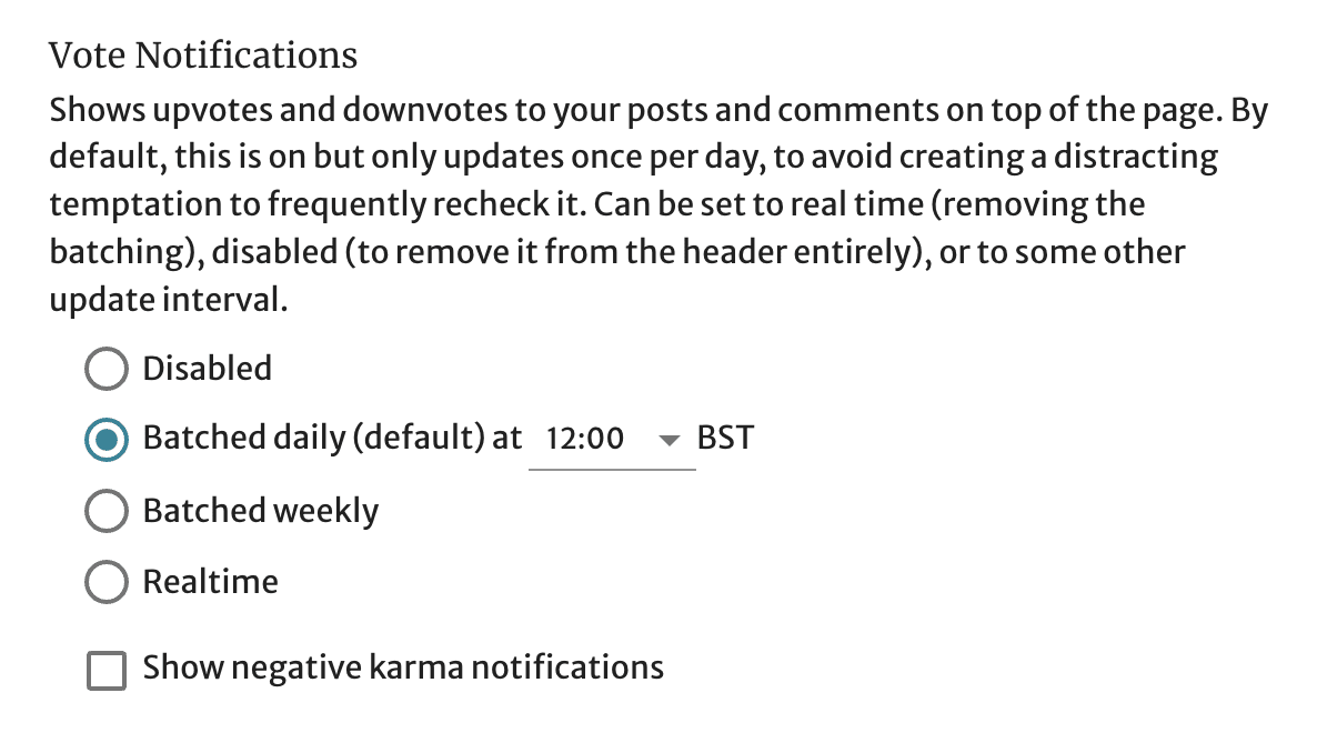 Also, as a reminder: you can change how you get karma notifications (or even disable them entirely). Go to your account settings (hover over your username, find “Account Settings”), and then find the “Notifications” section and change “Vote Notifications” appropriately. I’ve left mine at the default — notifications once per day, and no notifications for negative karma.