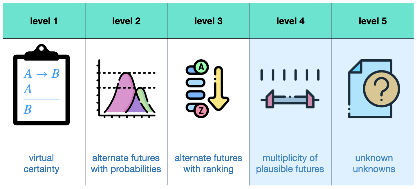 On the first level, you are looking at virtual certainty. It's (basically) a deterministic system. Level 2 uncertainty is the kind of uncertainty that most people refer to when they say uncertainty. It's the assumption that you know the probability distribution over alternate futures and is on a ratio scale[3]. Level 3 uncertainty is already rarer in its usage. It refers to alternate futures that you can only rank by their probabilities and is on an ordinal scale. In this case, we do not know the exact probabilities of future events but only which ones are more likely than others without indicating how much more likely.