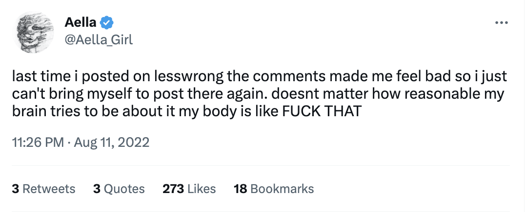 It seems like august!aella was really on the ball here; commenters just shouldn't make people feel bad so they just can't bring themselves to post there again. That's pretty simple and to-the-point.
