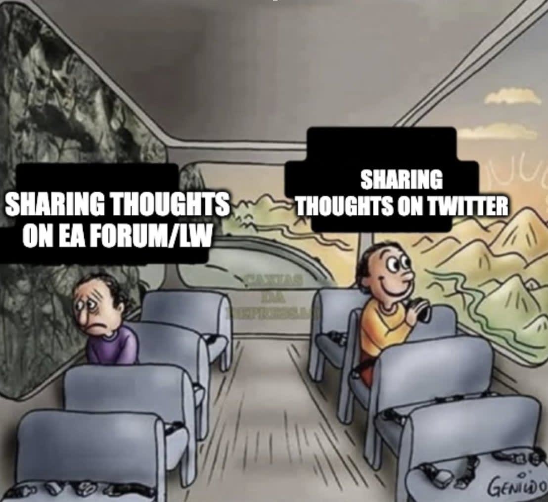 The problem is that there are antagonists out there, especially on twitter, and those antagonists do make full-baked snippets of propaganda, clever suggestions, and psychological trojan horses. You'll find examples everywhere you look. Twitter might feel friendly and safe, but it's actually just really good at posing like that (Goodharting); the idea that twitter is actually as friendly and safe as it feels (especially compared to EAforum and Lesswrong) is liable to cause a lot of harm, and thus is worth pointing out as harmful and wrong.